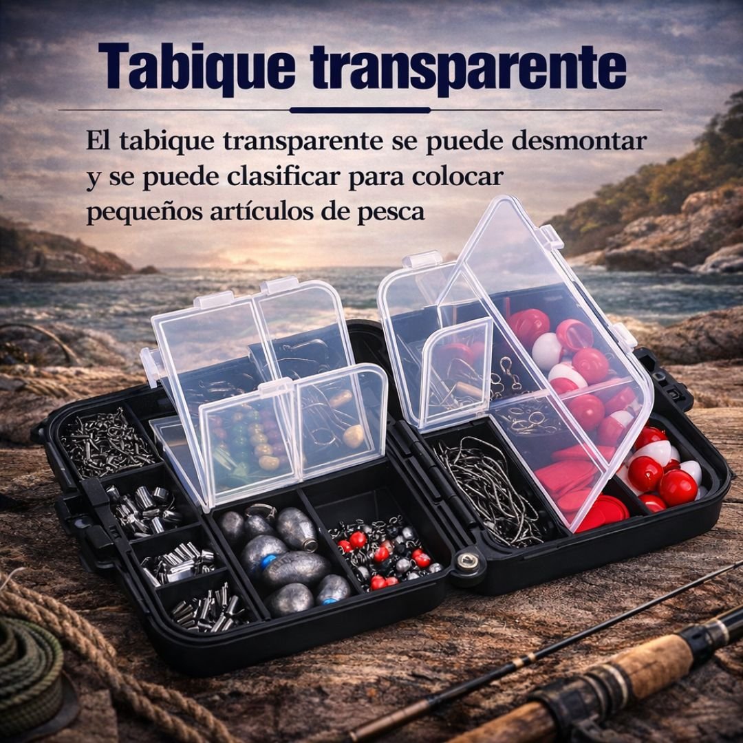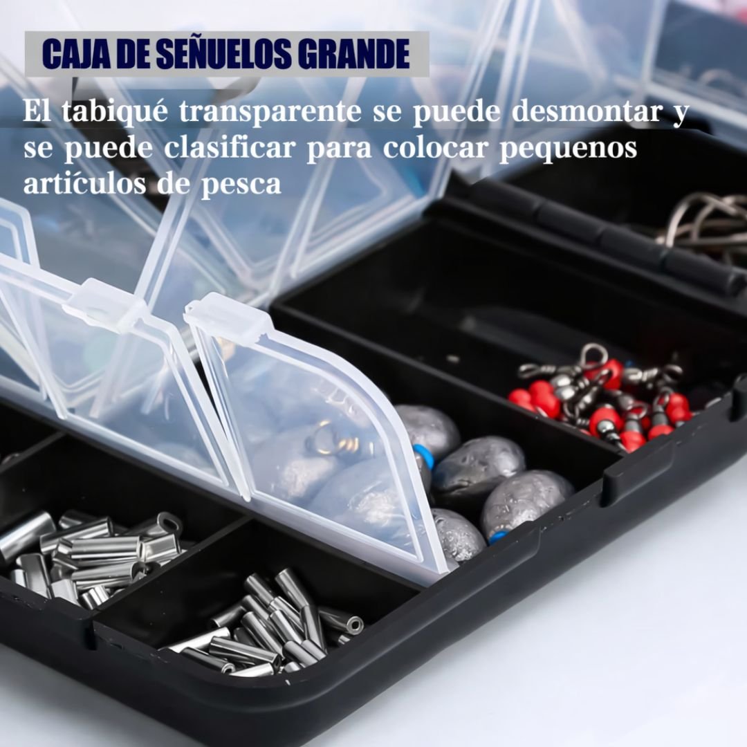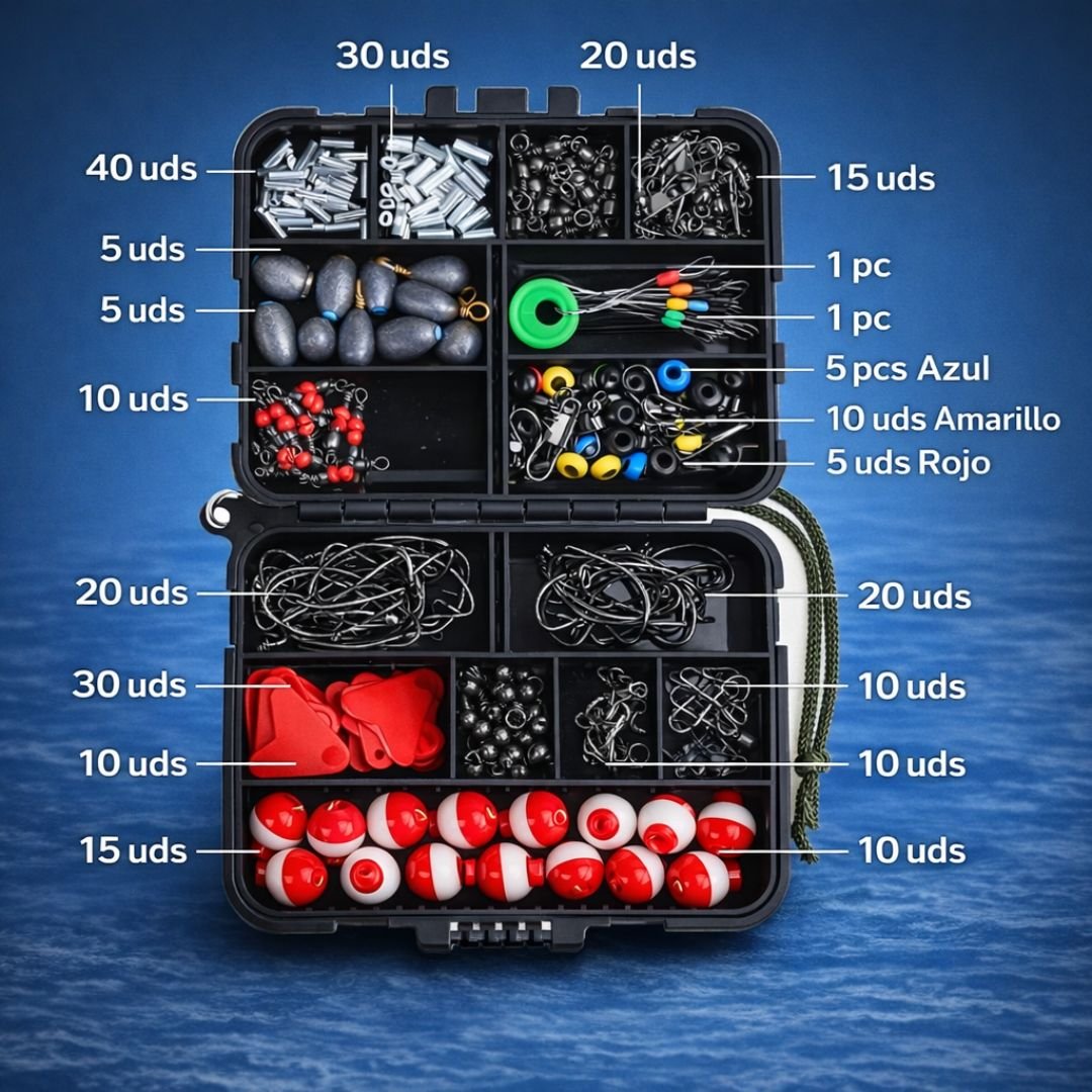 La Caja de Señuelos Grande DAMOR reúne en un solo kit una amplia variedad de accesorios esenciales para preparar tus aparejos de pesca de forma rápida, práctica y organizada.Incluye una caja resistente con divisores desmontables que permite clasificar cada elemento y mantener todo el equipo listo para usar en cualquier salida.Una solución completa pensada para pescadores que quieren concentrarse en lo importante: pescar.