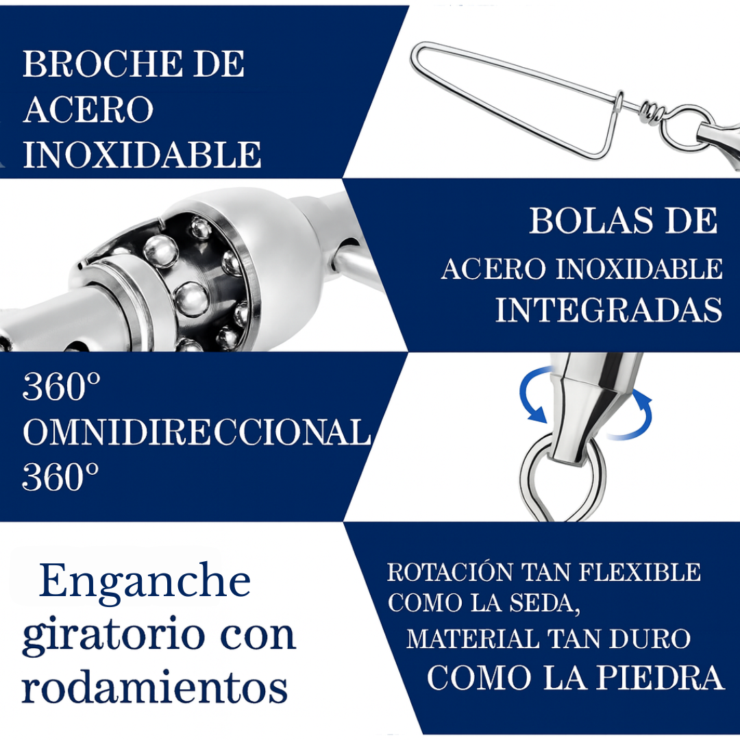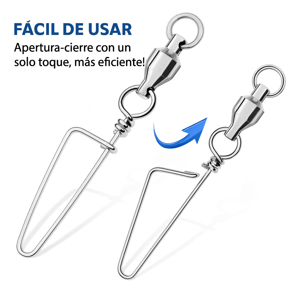 Diseñado para pescadores exigentes, este enganche rápido permite cambiar señuelos en segundos sin cortar la línea. Fabricado en acero inoxidable resistente a la corrosión, soporta hasta 19 kg de tracción y funciona tanto en agua dulce como salada. Su cierre firme evita aperturas accidentales y su perfil delgado no altera la acción del señuelo.