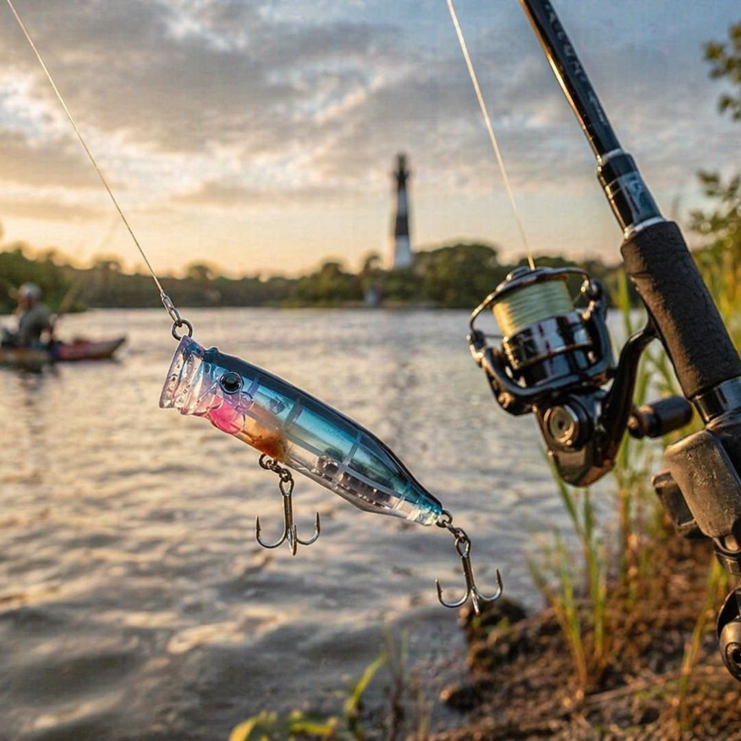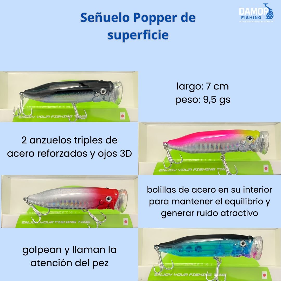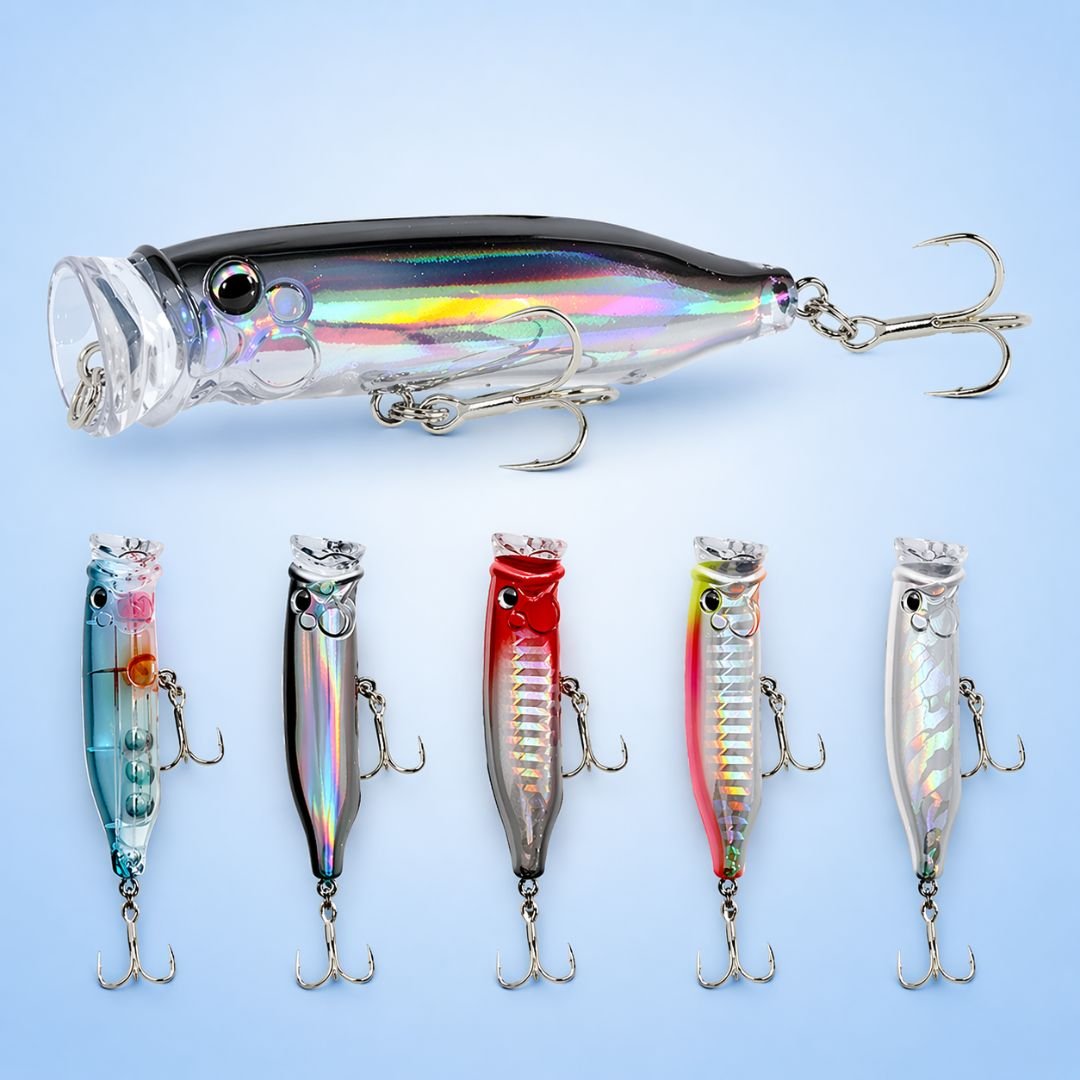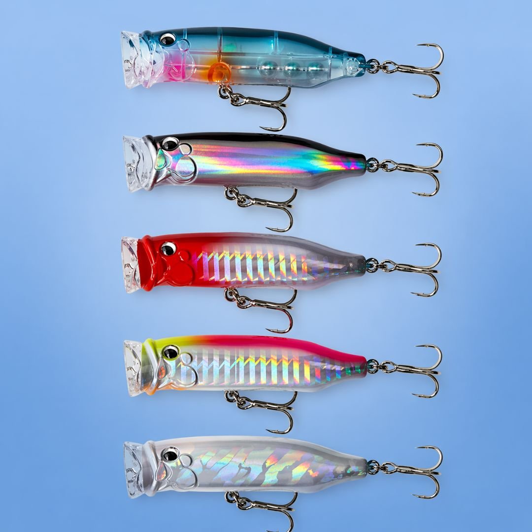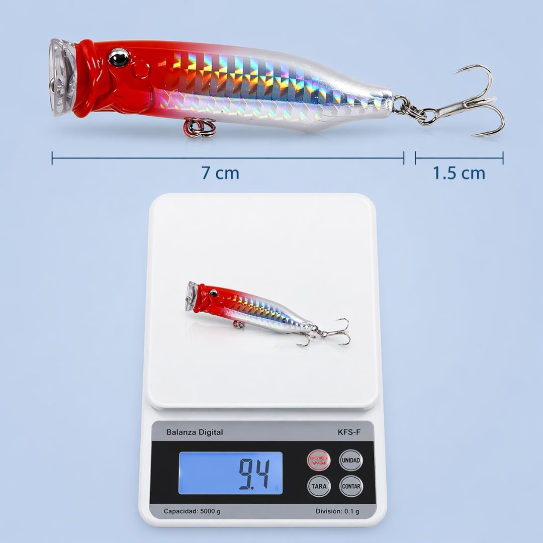 Diseñado para trabajar en la capa superior del agua, este popper produce sonido, turbulencia y alto impacto visual, provocando la reacción de peces depredadores.Su boca cóncava y acabado reflectivo permiten desplazar agua, generar el clásico efecto “pop” y destacar en diferentes condiciones de luz.