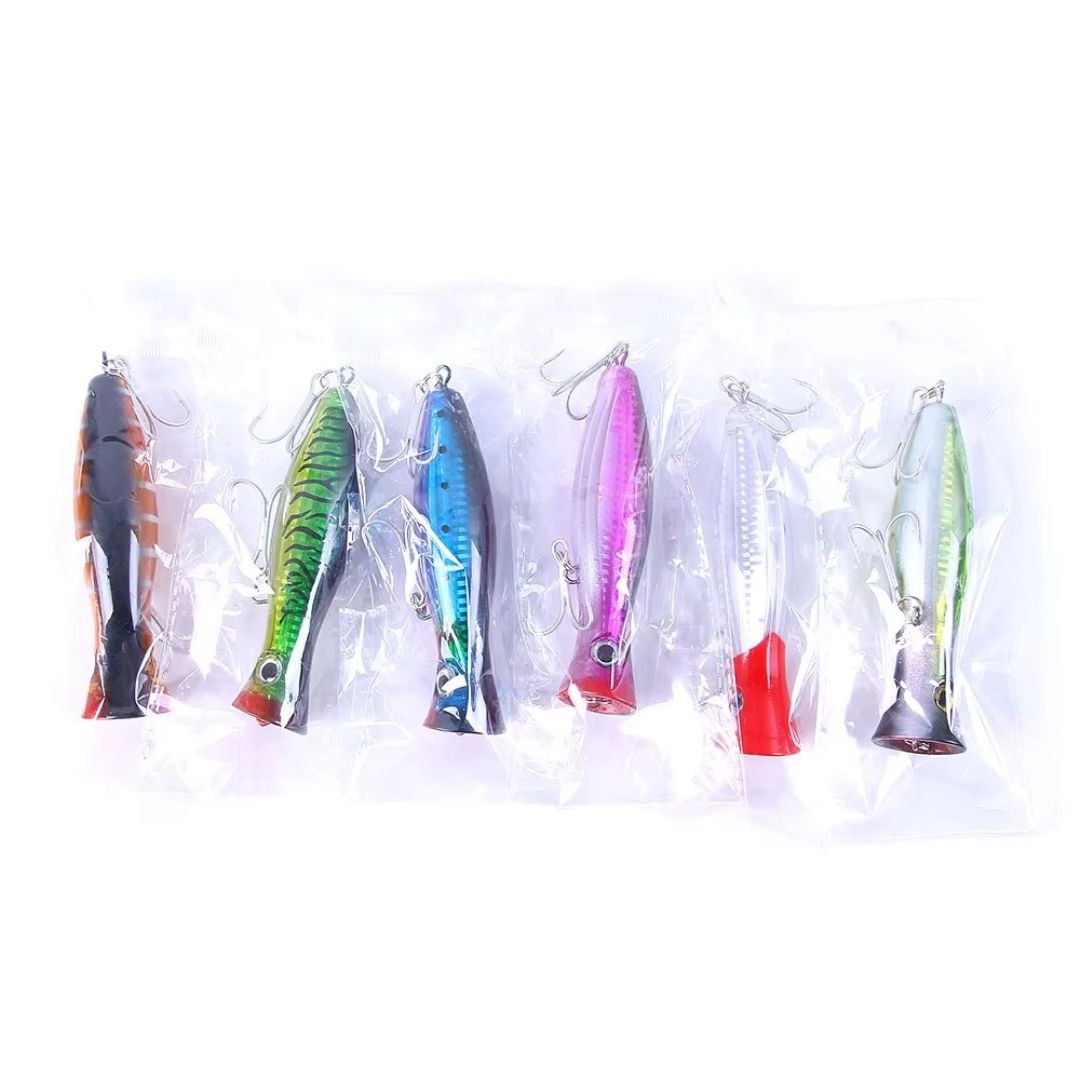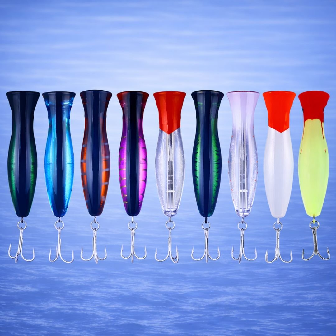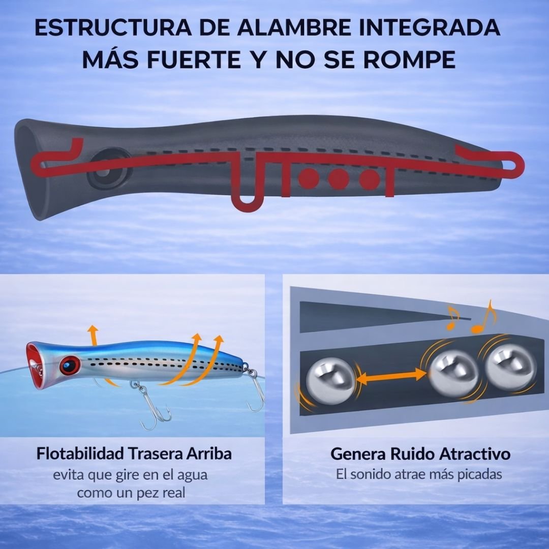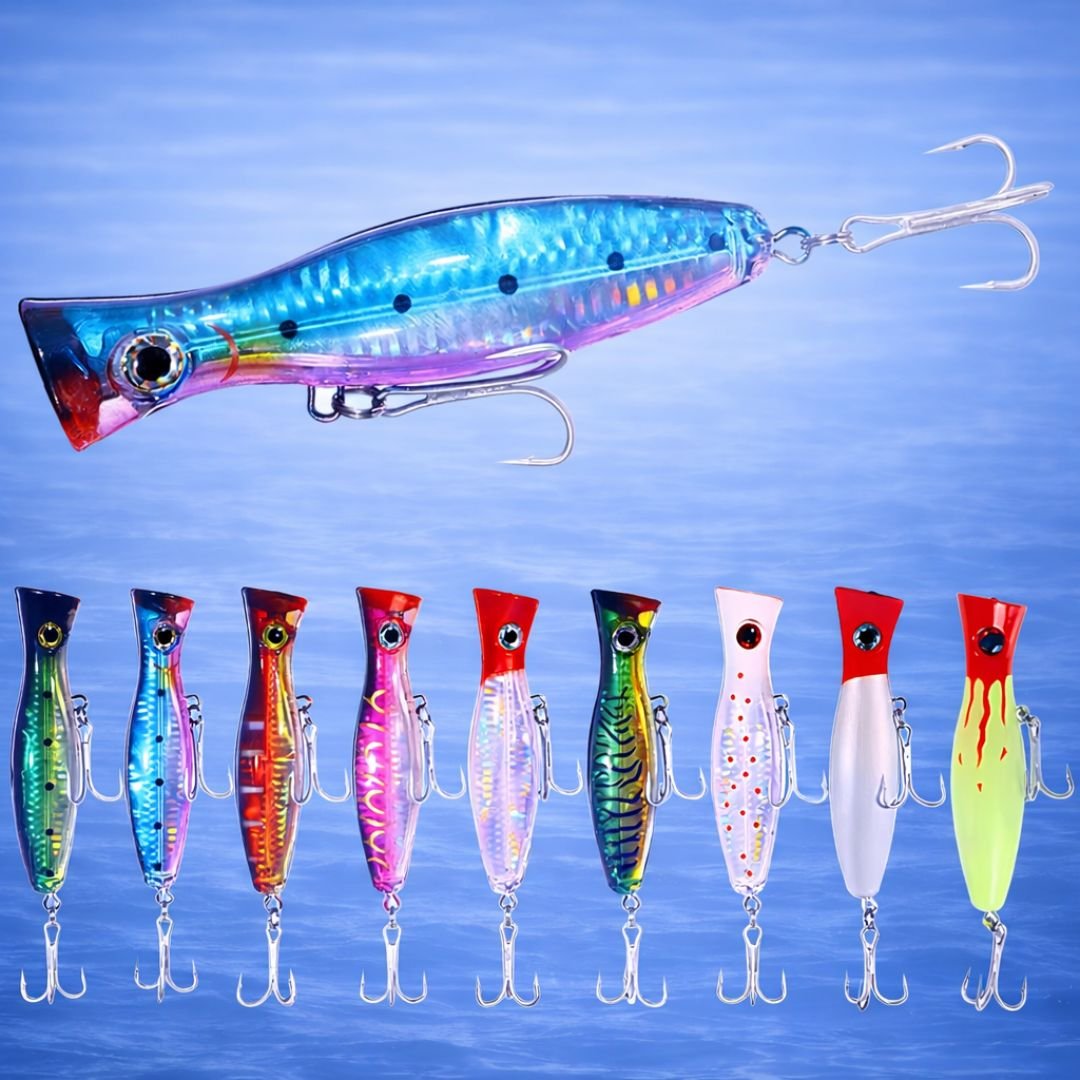 Los modelos tipo rana, popper y pato están diseñados para pesca de superficie, ideales para provocar ataques visuales en zonas con vegetación. El señuelo articulado trabaja en media agua con un nado en “S” muy realista, cubriendo distintos niveles según la situación.
